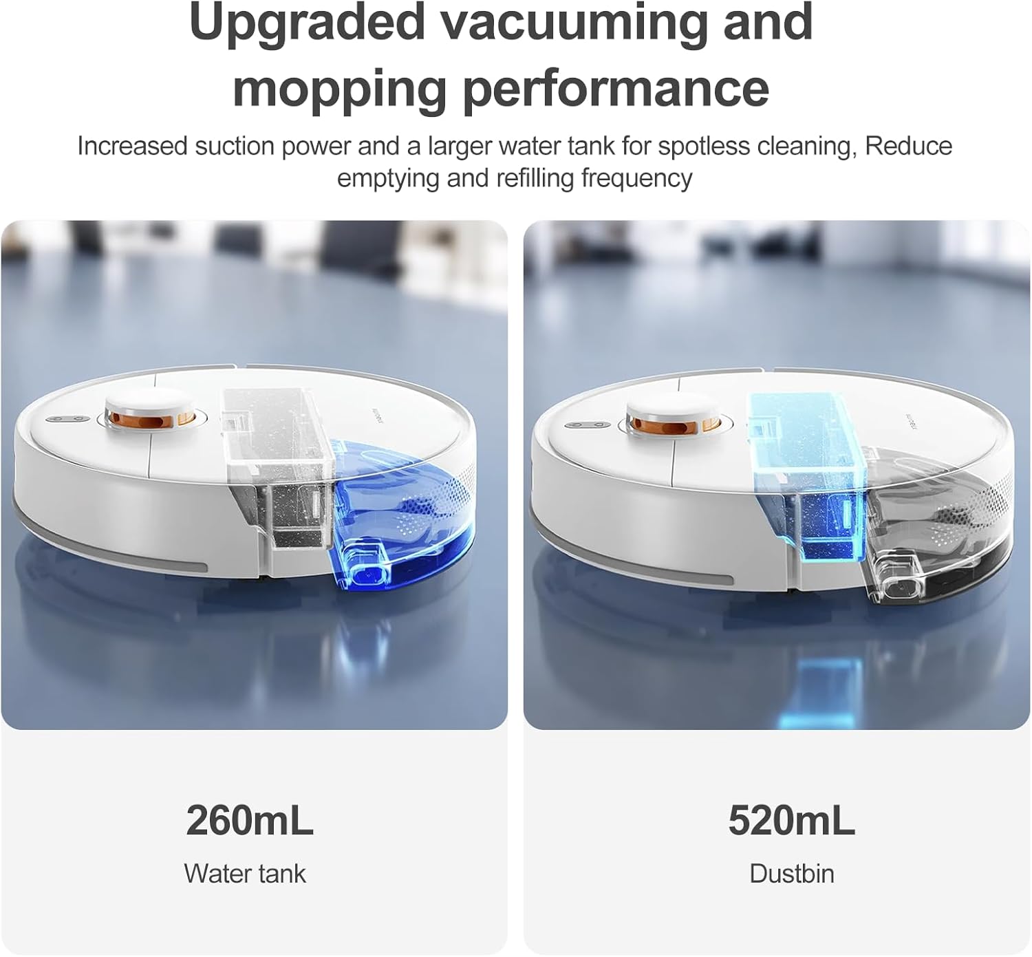 El Xiaomi S40C no se limita a aspirar: también barre y friega simultáneamente, ofreciendo una solución integral para mantener tu hogar impecable. Está equipado con un depósito de polvo de 520 ml y un tanque de agua de 260 ml, lo que le permite cubrir amplias superficies sin necesidad de vaciar o rellenar constantemente.
